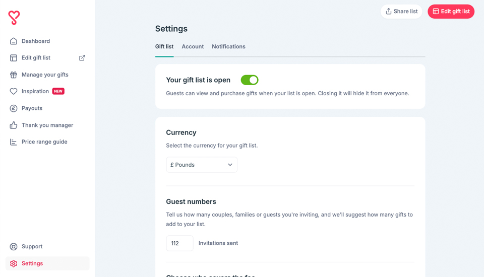 You can show or hide your gift list from your guests at any time. You will first need to head to the settings page and simply click the switch. If your list is closed, guests will not be able to access your list to purchase gifts.